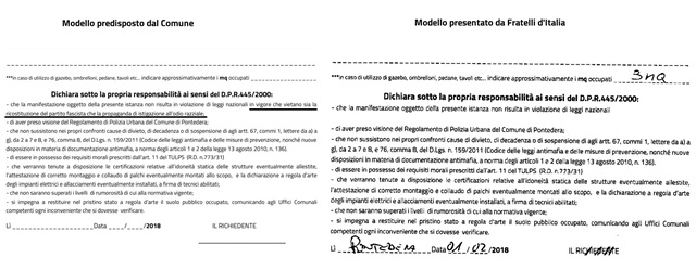 Scrive in primo cittadino Millozzi: “Giorgia Meloni di Fratelli d'Italia inveisce contro il Sindaco di Pontedera perché a suo avviso il Comune di Pontedera gli avrebbe negato il diritto di manifestare. Non commento. Racconto solo le cose come stanno per punti. 1) non è il Comune, ma la Questura che autorizza o nega una manifestazione politica. Nel caso di specie la manifestazione politica si è svolta regolarmente 2) se oltre la manifestazione viene richiesta l'installazione di palchi, gazebo o pedane sul suolo pubblico è il Comune tenuto a rilasciarne l'autorizzazione 3) le domande al Comune vanno presentate su un modello dedicato 4) Fratelli d'Italia ha presentato la richiesta su quell'apposito modello sbianchettando la parte di una dichiarazione in cui si richiama il rispetto di “norme nazionali in vigore che vietano sia la ricostituzione del partito fascista che la propaganda di istigazione all’odio razziale” (vedi allegati) 5) Gli uffici informano Fratelli d'Italia che la richiesta così artefatta è irricevibile. Alle grida ed alle rimostranze del segretario nazionale di Fratelli d'Italia non rispondo da Sindaco perché dal punto di vista amministrativo non ho nulla da aggiungere. Da cittadino però una domanda, non urlata ma garbata e cortese, la voglio fare io a Giorgia Meloni: “perchè il suo partito si è così prodigato per alterare un modulo e toglierci una frase richiamante leggi nazionali che vietano la ricostituzione del partito fascista e l'istigazione all'odio razziale?”. La formulo più semplice la domanda: 'Fratelli d'Italia è d'accordo con la costituzione e leggi della Repubblica su questo tema?'”.