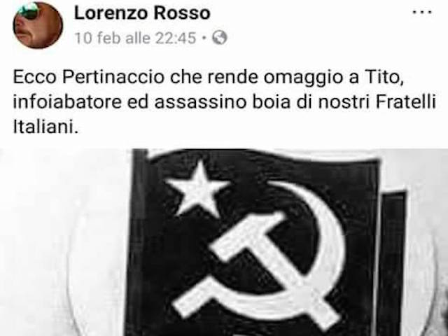 "Il vero volto di Fratelli d'Italia Rosso - continua Lattanzio - si scusi con tutti gli italiani, anche quelli di destra. Pertini è un pilastro della nostra democrazia. Se lo vuole attaccare almeno non sbagli foto. In quell'immagine Pertini piange al funerale di Berlinguer. Se non si riconosce nei valori democratici si dimetta da Consigliere comunale d'opposizione a Castelnuovo e la Meloni lo sospenda oppure chieda scusa a tutti i cittadini democratici".