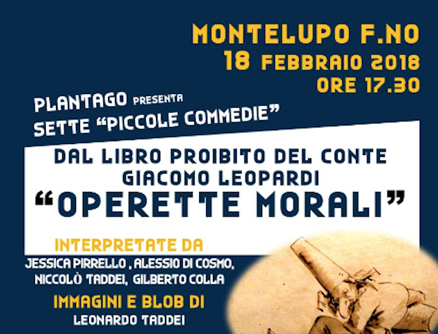 Sette “piccole commedie”, tratte da “Operette Morali” di Giacomo Leopardi, saranno presentate sotto forma di lettura scenica il prossimo 18 febbraio, alle 17.30, a Montelupo Fiorentino, presso la sede di Plantago in via giro delle mura 76.