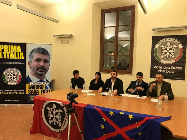 Successivamente è stato il turno di Leonardo Graziani, candidato alla Camera nel collegio uninominale di Firenze – Scandicci (Toscana – 02), che ha illustrato la proposta del Mutuo Sociale, un vecchio cavallo di battaglia di CasaPound che adesso è stato modificato per poter garantire il diritto alla proprietà della casa a tutti gli italiani. Dopo Graziani il microfono è passato a Chiara Romano, candidata alla Camera nel collegio uninominale di Sesto Fiorentino (Toscana – 03) nonché Responsabile delle attività sociali di CasaPound Firenze, che ha illustrato i servizi che quotidianamente svolge CPI a favore degli italiani in difficoltà, dalla raccolta alimentare e di vestiario allo sportello sociale con le attività di un vero e proprio patronato. Da sottolineare la chiusura del discorso della Romano, quando ha affermato che “comunque vadano le elezioni, lunedì 5 marzo ci troverete in sede a distribuire pacchi alimentari e aiutare i nostri connazionali con i nostri avvocati ed esperti previdenziali”.