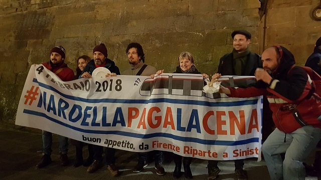 “Abbiamo esposto uno striscione di oltre 3 metri con la data del 14 febbraio 2018, la scritta ‘Nardella Paga La Cena’, il buon appetito da parte del gruppo e il disegno di una tramvia con tanti punti interrogativi come quelli che ogni giorno incontrando la cittadinanza e girando per le strade di Firenze ognuno di noi ha sui tempi e gli ulteriori disagi e sacrifici che verranno chiesti dal Comune prima di vedere, finalmente, le due nuove linee tramviarie in funzione. Non accettiamo più rinvii e nuovi imprevisti. Ancora non si capisce se le ditte che realizzano i lavori sono capaci di portare a fine i cantieri nei tempi promessi da Nardella o se ogni scusa da qui all’estate sarà buona per prendere altro tempo”.