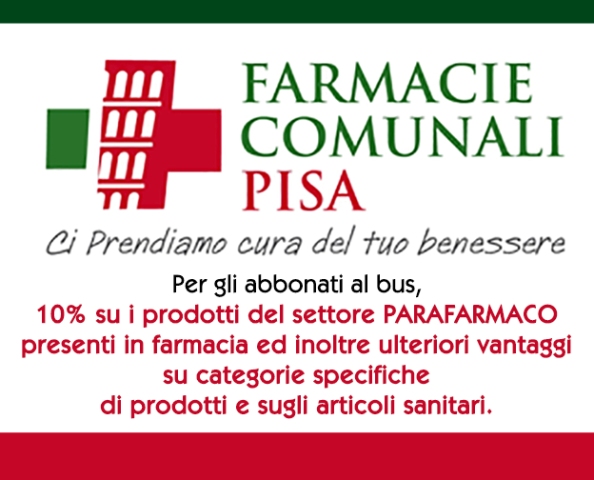 E’ stata firmata la convenzione fra CTT Nord (Società che gestisce i servizi di trasporto pubblico nei territori di Lucca, Massa-Carrara, Pisa, Livorno), e l’Azienda Farmacie di Pisa in virtù della quale si potranno applicare sconti del 10% agli abbonati al bus che acquisteranno prodotti parafarmaceutici e fitofarmaci che non siano già soggetti a sconti o vendite promozionali.