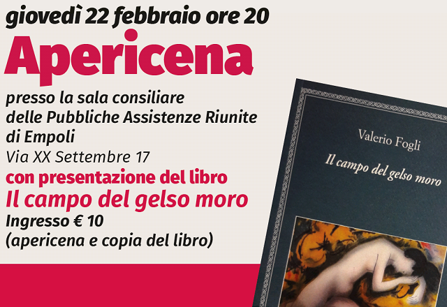 Sarà un aperitivo letterario molto speciale quello di Giovedì 22 Febbraio, a partire dalle 20, presso il Circolo delle Pubbliche Assistenze Riunite, a Empoli, in Via XX Settembre, 17. Sarà infatti presentato il libro “Il campo del gelso moro”, scritto da Valerio Fogli. Sarà presente l'autore.