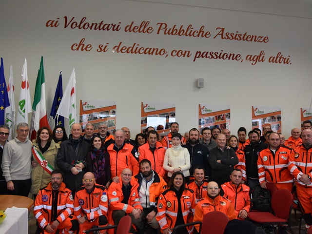All’interno della sala conferenze, oltre a una galleria di immagini sull’attività dei volontari, anche la dedica ‘Ai volontari delle Pubbliche assistenze che si dedicano con passione agli altri’.