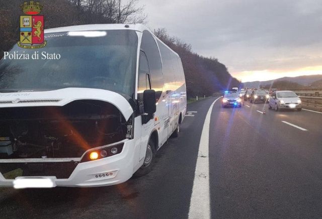 Vicino Calenzano (FI), sull’A1, il bus ha iniziato a perdere colpi e l’autista ha allertato la centrale operativa della Polstrada, che ha inviato sul posto una pattuglia della Sottosezione di Firenze Nord, di vigilanza proprio su quel tratto per prevenire i pericoli dovuti al maltempo. Infatti, dalla Direzione Centrale delle Specialità della Polizia di Stato era stato diramato l’allerta meteo, per consentire alla Polstrada in Toscana di sorvegliare le principali arterie regionali.