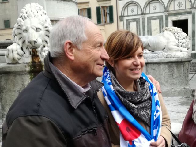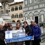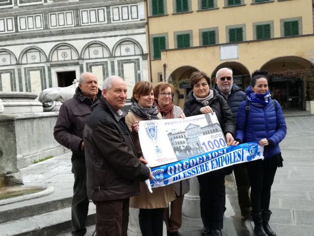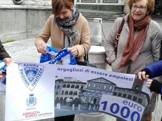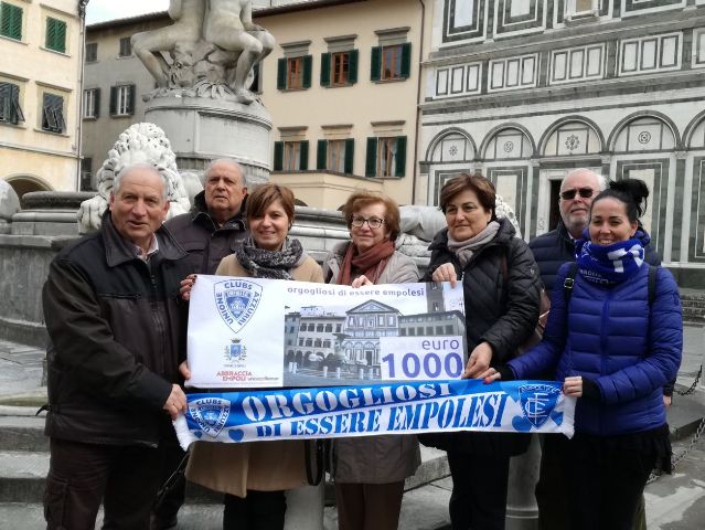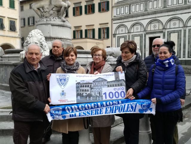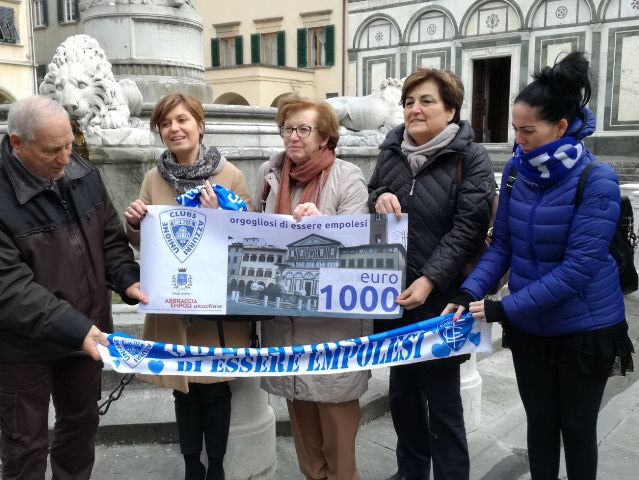 Un gesto che segna l'orgoglio di appartenere a un luogo a una città e a un simbolo. Questa mattina, 19 febbraio, alla Fontana dei Leoni in piazza Farinata degli Uberti, i tifosi dell'Empoli dell'Unione Clubs Azzurri, hanno consegnato al sindaco Brenda Barnini un assegno da 1000 euro per contribuire alla campagna di raccolta fondi 'Abbraccia Empoli' promossa dal Comune e a cura dell'Unicoop Firenze sc, per il restauro della Fontana delle Naiadi del Pampaloni, conosciuta a tutti come Fontana dei Leoni.