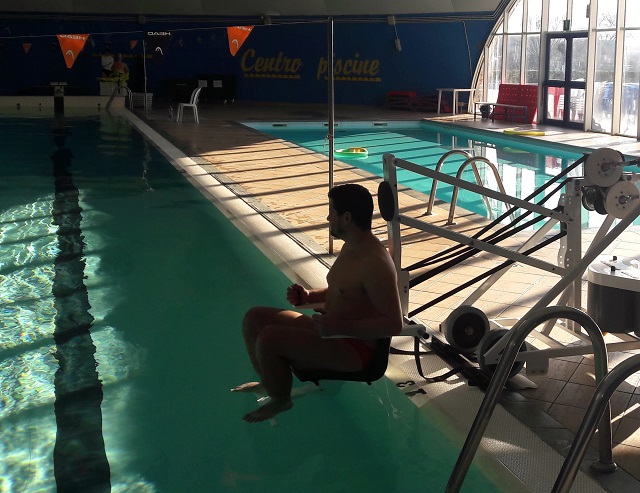Il sollevatore è a disposizione sul piano vasca, con assistenza del personale delle piscine. In questo modo persone con qualsiasi tipo di difficoltà sono in grado di partecipare, senza alcun ostacolo, a corsi, riabilitazione e attività in acqua.