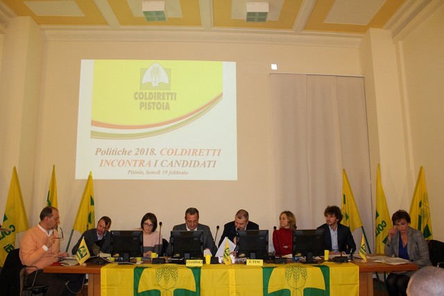 Sala della Camera di Commercio affollata dalla dirigenza territoriale di Coldiretti e pieno appoggio dei candidati al Manifesto politico dell'associazione, che ieri sera in vista delle elezioni del 4 marzo ha organizzato un incontro coi candidati nei collegi uninominali pistoiesi (massimo due esponenti per partito). Hanno risposto alla chiamata di Coldiretti Pistoia i rappresentanti di 4 schieramenti con i seguenti candidati nei collegi uninominali di Senato e Camera: Centro Destra, Patrizio La Pietra e Maurizio Carrara; PD, Caterina Bini e Edoardo Fanucci; Liberi e Uguali, Arianna Benigni; M5S, Sandra Magnani.