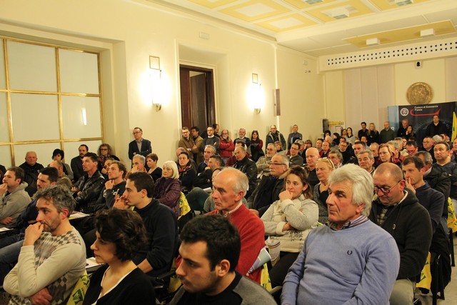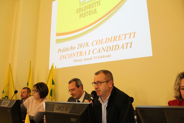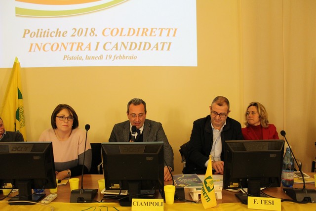 Sala della Camera di Commercio affollata dalla dirigenza territoriale di Coldiretti e pieno appoggio dei candidati al Manifesto politico dell'associazione, che ieri sera in vista delle elezioni del 4 marzo ha organizzato un incontro coi candidati nei collegi uninominali pistoiesi (massimo due esponenti per partito). Hanno risposto alla chiamata di Coldiretti Pistoia i rappresentanti di 4 schieramenti con i seguenti candidati nei collegi uninominali di Senato e Camera: Centro Destra, Patrizio La Pietra e Maurizio Carrara; PD, Caterina Bini e Edoardo Fanucci; Liberi e Uguali, Arianna Benigni; M5S, Sandra Magnani.