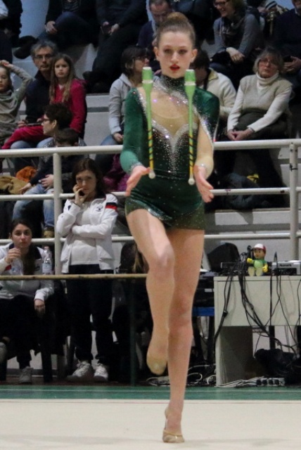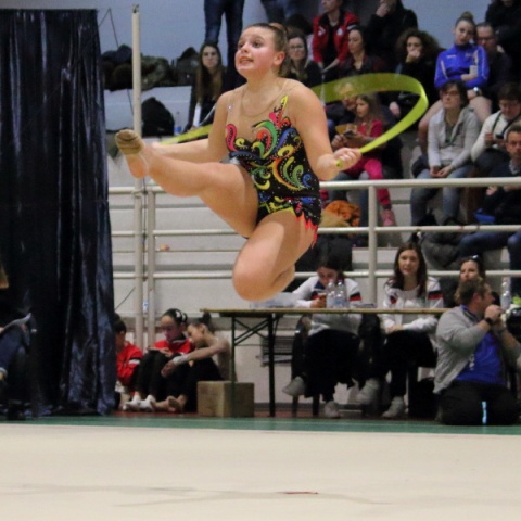 Ma veniamo alla due giorni. Sabato mattina si sono esibite Martina Alfaroli e Caterina Distante in seconda categoria Junior 2004/2005 classificate rispettivamente 6° e 11°, con due balletti con attrezzo corda l’uno e cerchio l’altro. La somma dei due punteggi ha determinato l’ordine di arrivo; Purtroppo qualche incertezza ha impedito loro di avvicinarsi un po’ di più al podio, ma restano comunque due atlete di grande valore.