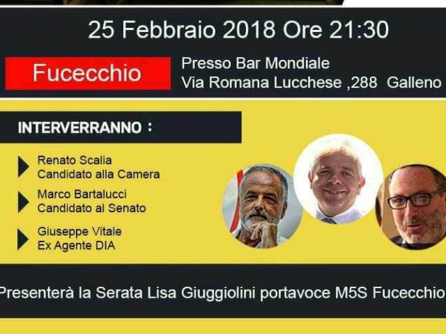 "Domenica 25 febbraio a Fucecchio interverranno sul tema sicurezza i candidati M5S Renato Scalia, Marco Bartalucci e Giuseppe Vitale. L’evento, sebbene si svolga nel Comune di Fucecchio presso il Bar Mondiale di Galleno, coinvolge anche i MeetUp dei Comuni di San Miniato, Montopoli, Santa Croce e Castelfranco su cui insistono le Cerbaie, territorio caratterizzato da un crescente degrado e importanti fenomeni di spaccio. Negli interventi si parlerà anche di infiltrazioni mafiose nel comprensorio e di legittima difesa. Si invitano a partecipare alla discussione tutti i cittadini interessati alle tematiche citate ed al programma nazionale del M5S. "
