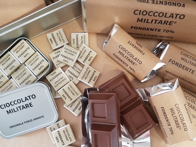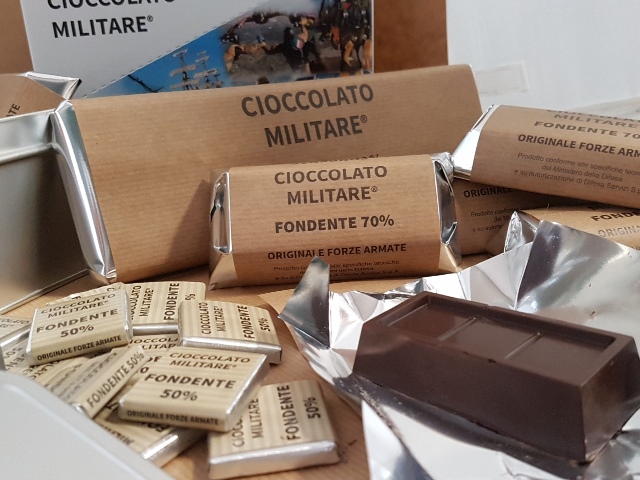Qualità ed energia, il Cioccolato Militare è un fondente al 70% e si presenta avvolto nella confezione storica delle Forze Armate, pensato oggi per esigenze di utilizzo in diversi formati: il “cubo” da 50g, 100g e la tavoletta da 200g. Completano la linea i cioccolatini da 5g ciascuno, disponibili anche in uno speciale astuccio di metallo, come si usava una volta ed una crema spalmabile, anche questa in tubetto di alluminio per l’uso sportivo.