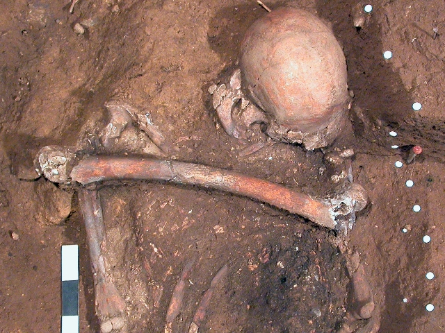 In allegato una fotografia del reperto messo a disposizione dagli archeologi del SAGAS appartenente a un individuo di sesso femminile di circa 25-35 anni e rinvenuto durante uno scavo in Sicilia. L'inumazione risale ad una fase terminale del Paleolitico. La sepoltura è stata violata durante il Paleolitico, poco dopo la sua deposizione, come dimostra la posizione del femore ritrovato sopra le spalle dell'inumato.