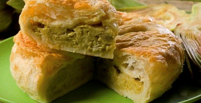 Pulite i carciofi, tagliateli a metà lessateli circa un quarto d’or in acqua salata e acidulata con il succo di limone, scolateli accuratamente, tagliateli a piccoli spicchi e fateli dorare a fuoco vivo per una decina di minuti con alcuni cucchiai d’olio, unendo solo alla fine della cottura il prezzemolo pulito e tritato. Lasciateli intiepidire e nel frattempo tirate la pasta a uno spessore di circa mezzo centimetro e formate due dischi, l’uno più grande dell’altro: con il più grande foderate una tortiera oliata e versatevi i carciofi che avrete precedentemente amalgamati alla besciamella e alla panna. Spolverate con del formaggio grattugiato, ricoprite con l’altro disco di pasta, premete i bordi con le dita per unirli e infornate a circa 200° gradi per circa mezzora.
