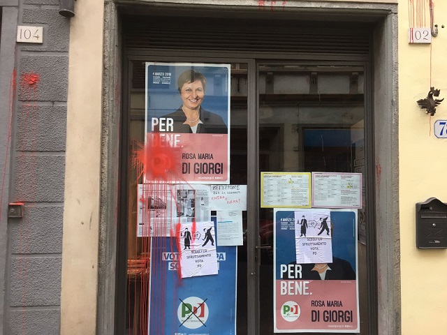 Una secchiata di vernice Rossa ed un volantino minatorio con ingiurie contro il Partito Democratico: è questo il risultato del raid vandalico contro la sede della sezione del Partito Democratico Oltrarno e punto d'ascolto del comitato elettorale della vicepresidente del senato Rosa Maria Di Giorgi, candidata alla Camera nel collegio uninominale Firenze-Scandicci, di cui fa parte il quartiere di Santo Spirito/San Frediano.