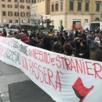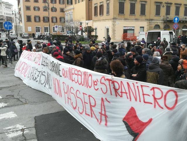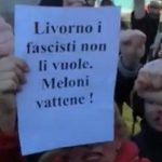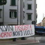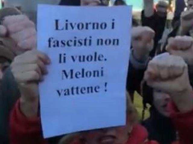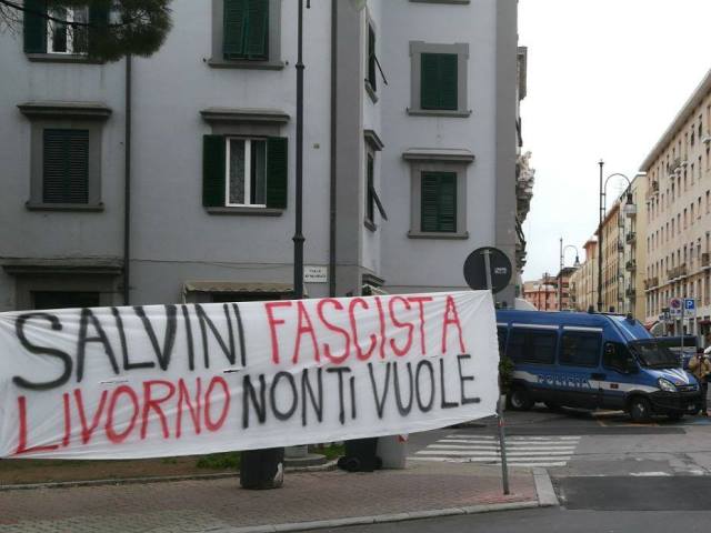La questura di Livorno ha disposto transenne anti-filtraggio anche in via delle Galere, accesso alla sala dove la Lega tiene un'iniziativa per la campagna elettorale, davanti alla quale i manifestanti si sono spostati intonando cori come 'Salvini a testa in giù', 'Livorno non ti vuole' e cantando Bella ciao.