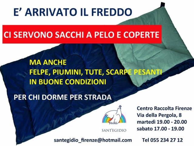Alcuni senza fissa dimora, già individuati, saranno accolti presso la sede della Comunità. Ogni martedì e sabato raccolta di coperte, sacchi a pelo e altri indumenti Burian non ferma la solidarietà. A Firenze la Comunità di Sant'Egidio aprirà da domenica sera la sua sede a dieci persone senza fissa dimora già individuate e invitate. Nel frattempo il martedì, dalle 19 alle 20, e il sabato dalle 17 alle 19, Sant'Egidio raccoglierà coperte, sacchi a pelo e anche felpe, piumini, tute da ginnastica, scarpe pesanti da uomo e in buone condizioni. In questi stessi orari chi vuole può aiutare a preparare e a distribuire la cena ai senza fissa dimora.