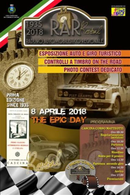 Il prossimo 8 aprile si svolgerà la 1° edizione della rievocazione storica datata 1935 del Raduno Automobilistico Regionale RAR, un raduno dinamico per autovetture storiche e sportive con ritrovo, partenza ed arrivo a Cascina in Corso Matteotti , organizzata dagli Amici di Cascina in collaborazione con Quattro Mori Expo Motori Asd CONI e il Gruppo Fotografico PHOTO EXPERIENCE di Cascina coinvolto nel photo contest dell’evento