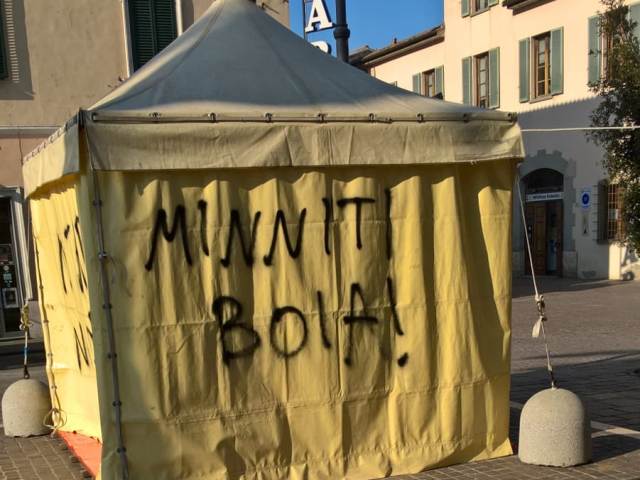 Così Antonio Mazzeo, vicesegretario del Pd della Toscana sul gazebo del PD imbrattato la scorsa notte in via Roma a Follonica.