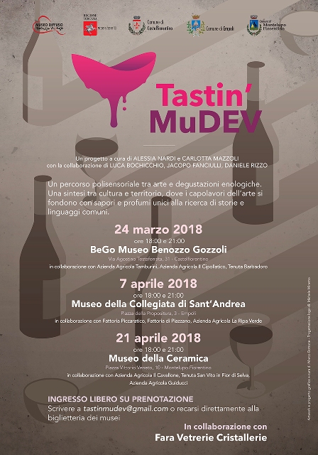 Tre serate da trascorrere in altrettanti musei aderenti al MuDEV, durante le quali poter conoscere sia il patrimonio artistico che quello vitivinicolo locale, abbinando degustazioni e opere d’arte: questo in sintesi il programma di Tastin’ MuDEV, progetto vincitore (su circa 30 progetti provenienti da tutta Italia) della call per artisti indetta dal Museo Diffuso Empolese Valdelsa lo scorso dicembre.