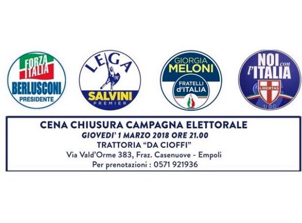 Domani, giovedì 1 marzo 2018, la coalizione di Centrodestra conclude la campagna elettorale empolese con una cena presso la nota Trattoria “Da Cioffi” a Casenuove - Via Val d’Orme, 383, Empoli.