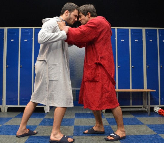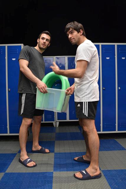Molto interessante la scelta registica di posizionare il pubblico all’interno della scenografia sul palco, che lo rende parte integrante dello spettacolo, e che gli fa vive in prima persona le vicende dei protagonisti, come se fosse nello spogliatoio insieme a loro, questo grazie anche alla straordinaria naturalezza con cui i due attori Giulio Maria Corso e Samuele Picchi , interpretano le vite dei due protagonisti, facendo trasparire cosi il grande legame amicizia e complicità e spensieratezza che c’è tra i due istruttori, proprio come accade nella vita reale. E altrettanto riescono a fare nella relazione conflittuale con la direttrice della piscina, molto ben interpretata da Monica Bauco.