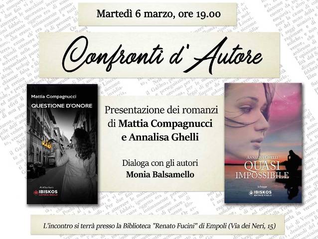 L’incontro, dal titolo “Confronti d’autore”, prevede la presentazione di due romanzi: Questione d’onore, di Mattia Compagnucci, e Quasi impossibile, di Annalisa Ghelli, entrambi editi dalla Ibiskos Risolo.