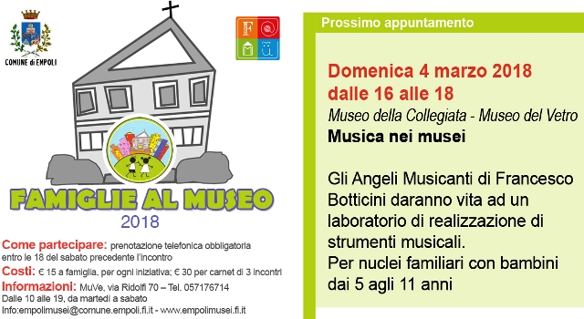 L’incontro, al costo di € 15 nucleo familiare, è rivolto a famiglie con bambini dai 5 agli 11 anni. La prenotazione è obbligatoria entro le 18 di sabato 3 marzo all’indirizzo email empolimusei@comune.empoli.fi.it, numero telefonico 0571 76714.