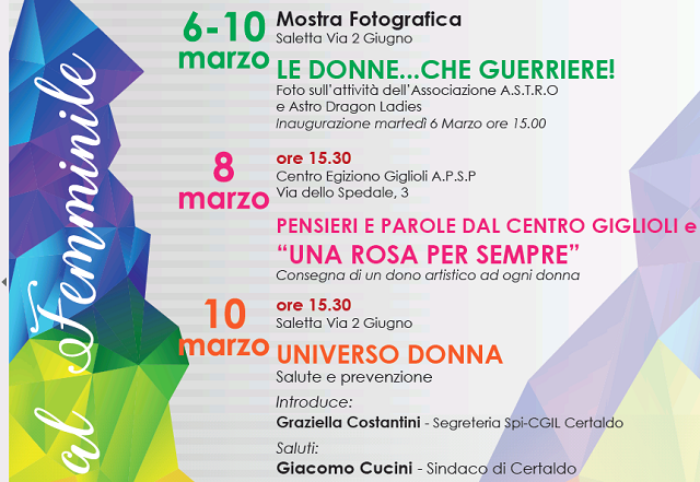 Sabato 10 marzo ore 15.30, nella Saletta di Via 2 Giugno, si terrà invece l’iniziativa più forte e caratterizzante questo 8 marzo 2018 per il Comune di Certaldo. La conferenza “Universo donna - Salute e prevenzione”. Introduce: Graziella Costantini - Segreteria Spi-CGIL Certaldo. Saluti: Giacomo Cucini - Sindaco di Certaldo; Daniela Borselli - Segreteria Spi-CGIL Firenze. Intervengono: il dottor Claudio Caponi - Coordinatore Centro Senologia Empoli; la dottoressa Caterina Masini - Medico di Medicina Generale; Paolo Scardigli - Presidente Associazione A.S.T.R.O.; Franca Criseo - Astro Dragon Ladies