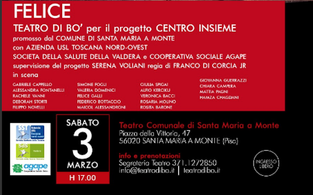 Sabato 3 Marzo alle ore 17:00 andrà in scena lo spettacolo “Felice”, presso il Teatro Comunale di Santa Maria a Monte (gestito dal 2014 dal “Teatro Di Bo’” sotto la Direzione Artistica di Franco Di Corcia Jr).