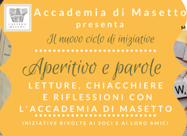 In attesa di riprendere il consueto ciclo di Conversazioni, l’Accademia propone una nuova iniziativa, rivolta ai soci e agli amici, per riscoprire il valore dell'incontro e del dialogo. Aperitivo e parole: letture, chiacchiere e riflessioni con l'Accademia di Masetto. Si tratta di una serie di appuntamenti presso il circolo di Spicchio, per parlare e riflettere su temi di letteratura, storia, arte, filosofia. Per rendere più gradevole il nostro “ragionare insieme” in ognuno degli appuntamenti è previsto, come momento conviviale e al costo di 6 euro, un'apericena a partire dalle 19.30, che precederà il colloquio sul tema indicato. Nel mese di marzo sono previsti i primi due incontri, durante i quali sarà anche possibile rinnovare o effettuare l'iscrizione per l'anno in corso.