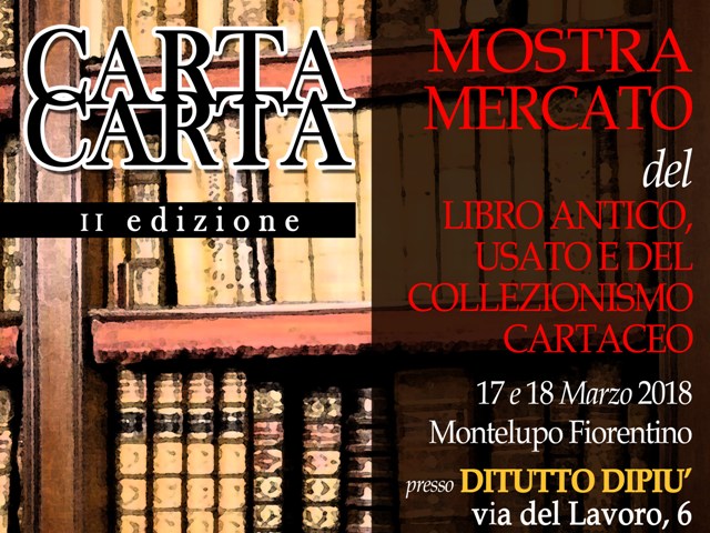 "Carta Carta" torna a Montelupo Fiorentino. La manifestazione dedicata al libro antico, usato, d'occasione e introvabile, al fumetto e a tutto il collezionismo cartaceo compresa la fotografia, si svolgerà sabato 17 e domenica 18 marzo 2018 negli spazi del gigantesco magazzino dell'usato DITUTTO DIPIU' di Montelupo Fiorentino: dove si può trovare dallo “spillo al cannone”, oltre 2000 mq distribuiti in diverse sezioni.