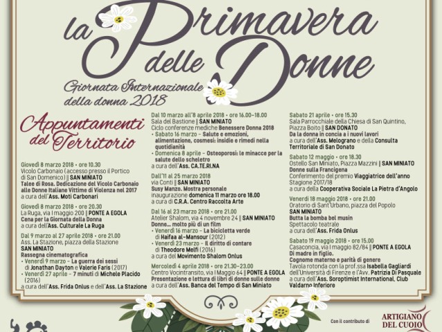 L'ultimo appuntamento è previsto per venerdì 25 maggio, alle 17.30, nella Sala del Consiglio, con la tavola rotonda dal titolo “Donne, politica e stereotipi nei contesti locali”, un'iniziativa organizzata in collaborazione con il consiglio comunale di San Miniato, la Commissione regionale pari opportunità e l'associazione Chirone. Tanti anche gli appuntamenti organizzate dalle varie associazioni del territorio, patrocinati dal Comune di San Miniato, che si protrarranno fino alla fine del mese di maggio.