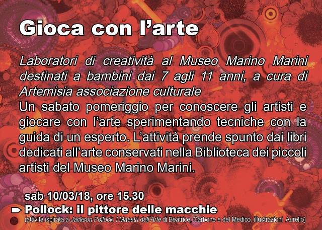 Come in un gioco di scatole cinesi, la sezione dei laboratori ludici legati al gioco dell'arte si inserisce in un più ampio cartellone di eventi ed iniziative che il museo pistoiese ha messo in piedi insieme alle associazioni del territorio in particolare al fianco degli esperti e degli educatori di Artemisia, condotta dalla storica dell’arte Annamaria Iacuzzi. Le iniziative si terranno nell'atelier permanente del museo, in uno spazio colorato e attrezzato, realizzato appositamente per stimolare il mondo dei bambini, sospeso tra emozioni, fantasia e passioni artistiche. Si ispira all’action painting di Jackson Pollock, uno dei maggiori rappresentanti dell'espressionismo astratto, il laboratorio “Il pittore delle macchie” che coinvolgerà i bambini in un'attività sperimentale traendo spunto dal libro “Jackson Pollock” di Beatrice, Carbone, Medico, illustrazioni Aurelio.