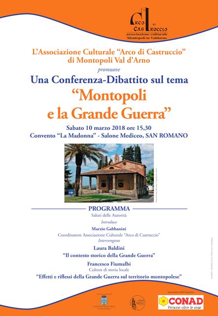 L’Associazione Culturale “Arco di Castruccio” di Montopoli Val d’Arno, Vi invita alla Conferenza - Dibattito sul tema “Montopoli e la Grande Guerra”; che si terrà presso il Convento “La Madonna” - Salone Mediceo a San Romano, sabato 10 marzo 2018 ore 15,30.