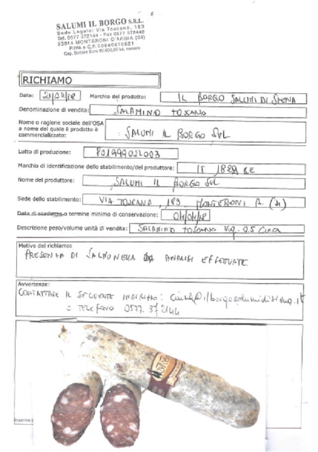 Il salamino toscano dell'azienda Salumi Il Borgo di Monteroni d'Arbia è stato richiamato in quanto si evidenzia la "presenza di salmonella dalle analisi effettuate". A scriverlo è il Ministero della Salute. Il lotto interessato, secondo quanto si legge sempre dagli avvisi di sicurezza pubblicati sul sito del ministero, è il numero 801999021003, con termine minimo di conservazione al 4 aprile 2018.