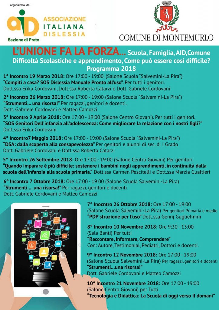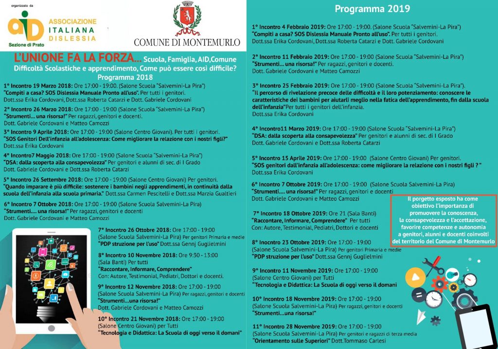 A Montemurlo, per aiutare le famiglie di bambini e ragazzi che presentano queste difficoltà, nasce un progetto innovativo dal titolo L'unione fa la forza… Scuola, Famiglia, Aid, Comune. Difficoltà scolastiche e apprendimento: come può essere così difficile? che mette insieme per l'appunto il Comune, le scuole (istituto comprensivo “Margherita Hack”, Liceo artistico “Umberto Brunelleschi” e la scuola paritaria “Sacro Cuore”), le famiglie, l'Aid, l'associazione italiana dislessia sezione di Prato e i pediatri.