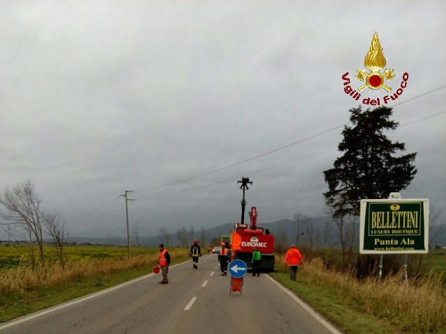 Un camion che stava lavorando con un braccio meccanico, ha urtato inavvertitamente un cavo dell'alta tensione sulla S. P. Castiglionese poco dopo il Centro Quadrupedi. Sul posto sono intervenuti i vigli del fuoco del Comando di Grosseto. Fortunatamente la scarica elettrica non ha investito gli operai che stavano lavorando nelle vicinanze e nemmeno l'autista del mezzo, visto che le gomme del mezzo hanno scaricato a terra la carica elettrica. Visto che il braccio meccanico si trova molto vicino ai cavi, per il momento le operazioni di soccorso sono bloccate in attesa che la linea dell'alta tensione sia disattivata. Attualmente la strada è chiusa al traffico e sul posto c'è anche la Polizia Municipale di Grosseto.