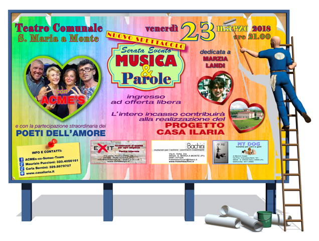 La serata denominata “Musica & Parole” è dedicata al ricordo di Marzia Landi, e sarà allietata dagli ACME's, con un rinnovato repertorio di canzoni senza tempo, con la partecipazione straordinaria dei Poeti dell'Amore. Come sempre l'ingresso sarà ad offerta libera, e l'intero ricavato contribuirà alla realizzazione del progetto Casa Ilaria.