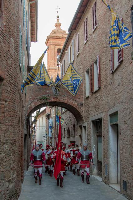Ad aprire per primo, alle 15.00 di sabato, sarà proprio il mercatino; un modo piacevole per trascorrere il pomeriggio in attesa di uno dei momenti più attesi dai contradaioli. Nella sala consiliare del Palazzo Comunale il Sindaco Giacomo Grazi, con il Presidente dell’Associazione Sagra di San Giuseppe Yuri Cardini e con i Presidenti delle otto contrade, procederà infatti all’estrazione delle quattro batterie eliminatorie del Palio; in contemporanea, in Piazza Matteotti, andrà in scena la rievocazione dell’arrivo in città, nel 1358, dell’avventuriero Anichino di Bongardo, poi sconfitto nella battaglia di Torrita dai perugini, che comunicherà in maniera spettacolare il responso dei bussolotti.