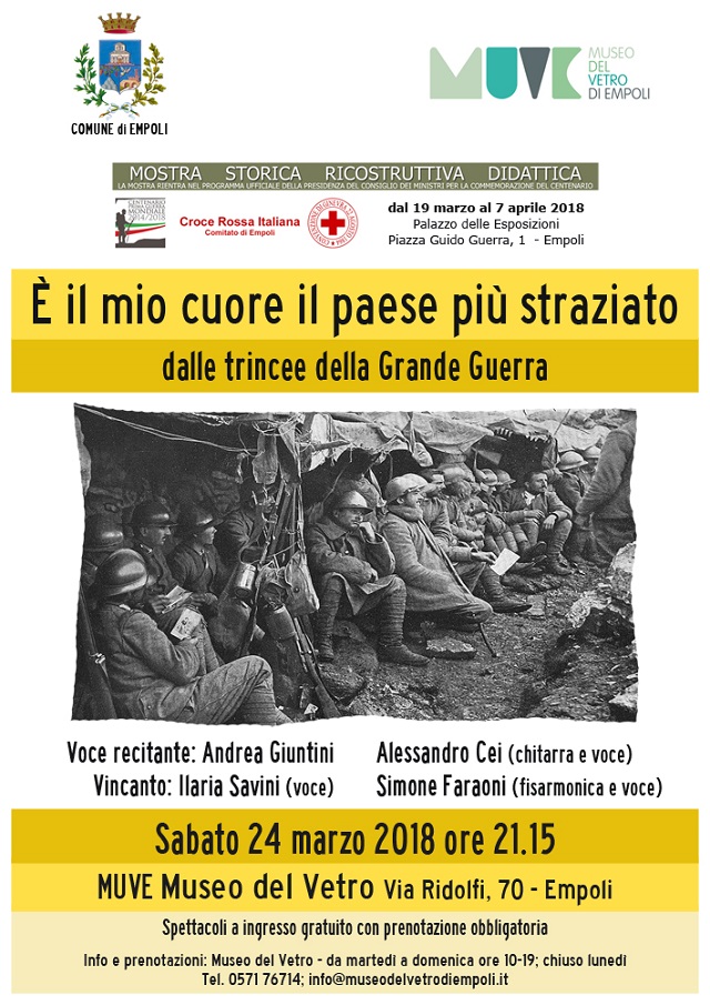 Intitolato “E’ il mio cuore il paese più straziato”, l’evento si terrà al Museo del Vetro - via Ridolfi 70 - a Empoli, sabato 24 marzo, alle 21.15. Saranno i musicisti dei Vincanto (trio dedito allo studio e alla riproposta della musica di tradizione orale italiana, attivo del 2003) e l’attore, molto noto e di grande esperienza, Andrea Giuntini, che con le loro letture e canzoni, accompagneranno il pubblico nei ricordi di quella guerra, a oltre cento anni di distanza. Lo spettacolo è ad ingresso libero, ma sempre su prenotazione da effettuare al numero 0571 76714.