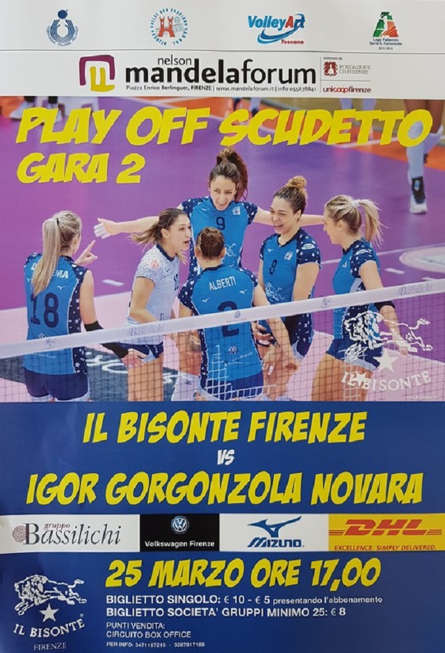 In vista di gara due dei quarti di finale dei play off della Samsung Galaxy Volley Cup di serie A1, in programma domenica alle 17 al Mandela Forum contro la Igor Gorgonzola Novara, la società Il Bisonte Firenze ha pensato a una promozione speciale per i suoi abbonati, visto che la tessera vale solo per la regular season: presentandosi con l'abbonamento in biglietteria, il prezzo del tagliando per la partita con Novara sarà di soli 5 euro, la metà quindi rispetto al costo normale per tutti gli altri spettatori che rimane fissato a 10 euro. Un’altra promozione riguarda invece le società sportive: per gruppi composti da almeno 25 persone, il tagliando avrà un prezzo di 8 euro cadauno. Per informazioni rivolgersi al 3471187215 o al 3287817188.