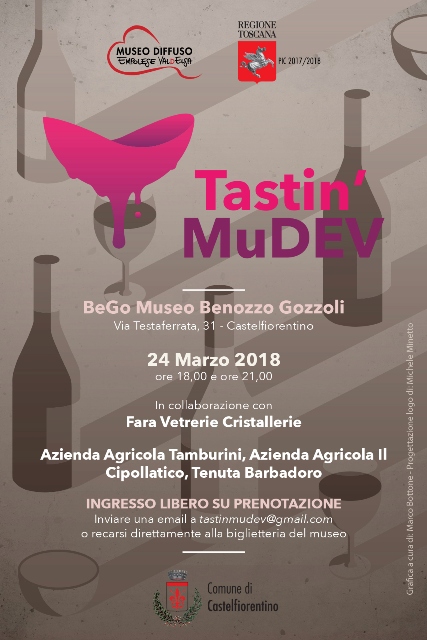 Sabato 24 marzo 2018 alle ore 18 (replica ore 21) si terrà al BeGo, - il museo di Castelfiorentino dedicato a Benozzo Gozzoli - il primo dei tre eventi Tastin’ MuDEV, ovvero una serata al museo speciale, durante la quale si potranno conoscere sia il patrimonio artistico che quello vitivinicolo locale, abbinando degustazioni e opere d’arte.
