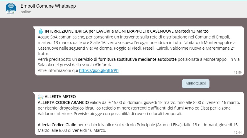 WhatsEmpoli (numero da salvare sul proprio telefonino 338 655 3630) fornisce al cittadino che si è iscritto messaggi di pubblica utilità che spaziano dalla viabilità, alle interruzioni idriche, con grande apprezzamento per le farmacie di turno e per le allerte meteo.