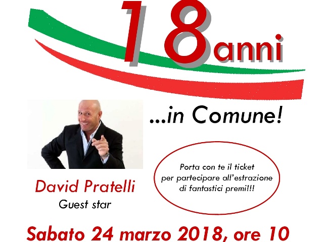 Protagonisti per un giorno saranno 249 diciottenni residenti a San Miniato. Sabato 24 marzo, dalle 10, li attende una grande festa all’Auditorium Carismi (piazza Buonaparte a San Miniato), “18 anni in... Comune!”, l’occasione per celebrare il traguardo della maggiore età. Ad organizzare l’iniziativa, per il terzo anno consecutivo, sono il Comune in collaborazione con Carismi - Gruppo Bancario Crédit Agricole Italia. Saranno presenti il sindaco Vittorio Gabbanini, Massimo Cerbai direttore generale CARISMI - Gruppo Bancario Crédit Agricole Italia, il vescovo monsignor Andrea Migliavacca, il presidente del consiglio regionale Eugenio Giani, Stefano Nesi presidente di NGM e le classi quinte dell’IT “Cattaneo” e del Liceo “Marconi”. Tante le sorprese previste per l’intensa mattinata degli studenti che, nel 2017, hanno compiuto 18 anni. Ospite d’eccezione l’autore, attore e comico pisano David Pratelli.