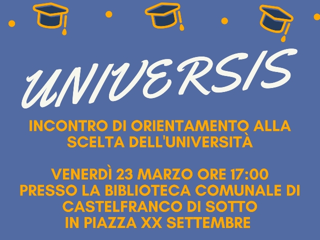 Sei uno studente all’ultimo anno delle scuole superiori e hai ancora molti dubbi sul futuro dei tuoi studi? Ti affacci al mondo delle università e ti senti sperso nell’offerta formativa? Niente paura, venerdì 23 marzo nei locali della Biblioteca di Castelfranco di Sotto è in programma l’incontro “Universis” per facilitare l’orientamento alla scelta del percorso universitario. L’appuntamento si terrà dalle ore 17 alle ore 18,30