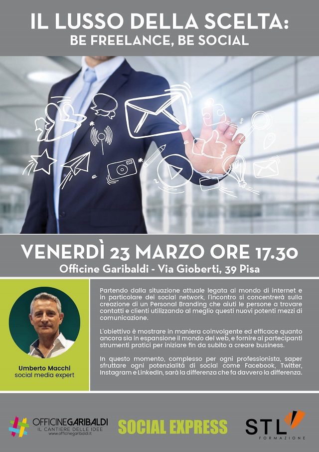 Giovedì 23 marzo Umberto Macchi sarà dalle 17.30 alle 20.00 alle Officine Garibaldi in collaborazione con STL Formazione per un intervento GRATUITO dal titolo "Il lusso della scelta: be freelance, be social”.