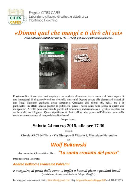 Il Laboratorio cittadino "Cities-Cafés" organizza sabato 24 marzo 2018, alle ore 17.30 presso il Circolo ARCI dell’Erta - Via Giuseppe di Vittorio 1, Montelupo Fiorentino un incontro con Wolf Bukowski che presenterà il suo ultimo libro: “La santa crociata del porco”. A seguire, al posto della cena... buffet a base di pizza e prodotti locali (previsto un piccolo contributo sociale per il buffet)