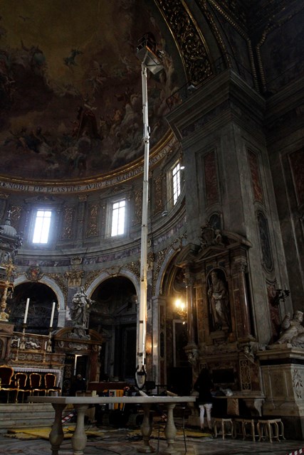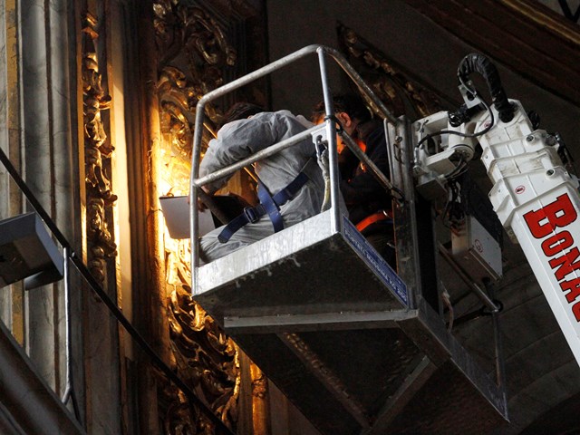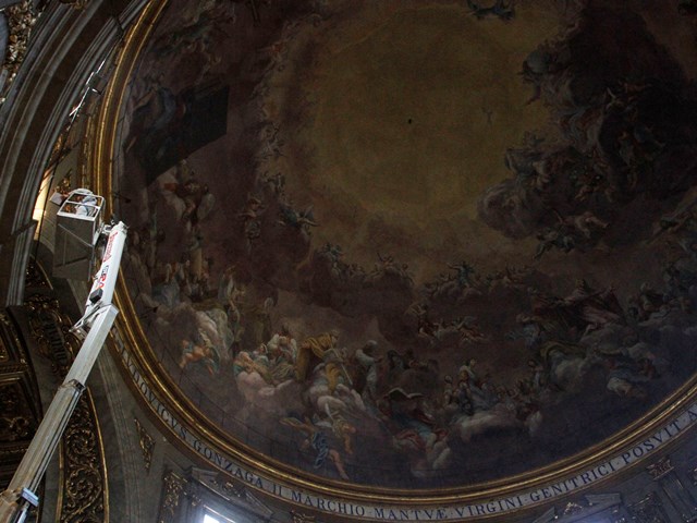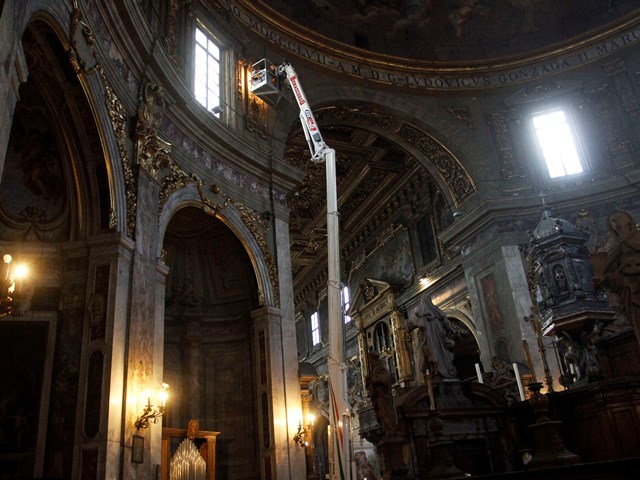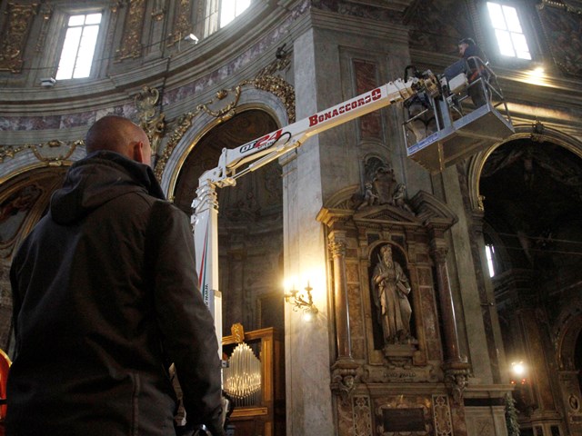 Un ‘ragno’, ovvero uno speciale carrello mobile munito di una piattaforma elevatrice, sta lavorando in questi giorni all’interno della Basilica della Santissima Annunziata per una ricognizione e verifica degli apparati architettonici e decorativi interni nell’ambito del programma di manutenzione preventiva e programmata avviato dall’Amministrazione comunale sul patrimonio monumentale cittadino. E’ lo stesso macchinario utilizzato qualche settimana fa nella chiesa del Carmine.