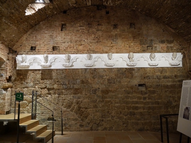 Per la prima volta saranno esposte al pubblico otto grandi sculture raffiguranti delle teste maschili e femminili, in origine collocate nella parte alta della facciata del battistero senese, incompiuta rispetto al progetto originario. Le protomi sono state estratte dalla facciata per poterne garantire la conservazione e sono state sostituite in loco da calchi: la secolare esposizione delle sculture agli agenti atmosferici e all’inquinamento ha infatti provocato una generale corrosione degli strati superficiali del marmo e, in alcuni casi, delle fessurazioni e la forte alterazione dell’intaglio lapideo. Dopo un attento restauro, le sculture sono presentate al pubblico con un elaborato allestimento museografico, che evoca la loro funzione e collocazione originarie.